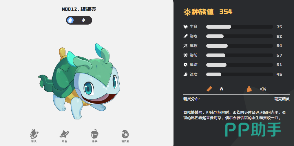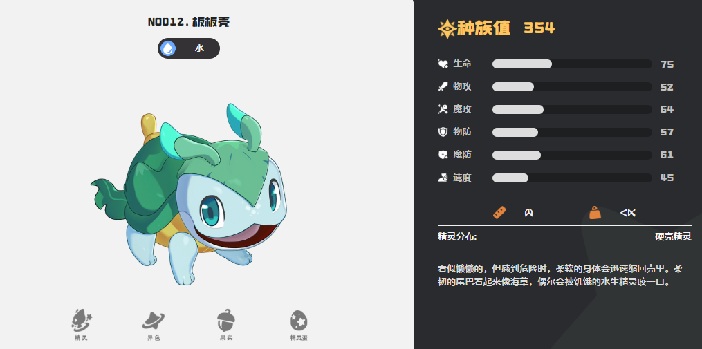 板板壳为水系防御向精灵,外形酷似行动迟缓的龟类生物,但实战定位明确——团队壁垒。其特性“厚甲”使每次使用防御类技能时,额外提升2点防御数值。该增益可叠加,配合高阶守护技(如铁壁、光之壁)可快速构筑高容错防线,同时为队友创造反打窗口,是持久战与阵地战阵容的理想前排人选。