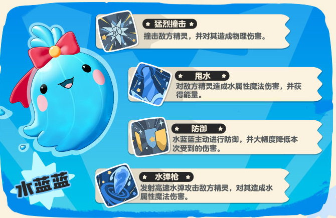 水蓝蓝是水系宠物,适合喜欢灵活操作,用控制技能打乱敌人节奏,施展多样战术的玩家,它的特性 “浸润” 相当实用,使用水系技能后,所有技能释放所需的能量将会降低,战斗中能频繁释放技能,掌握主动权。