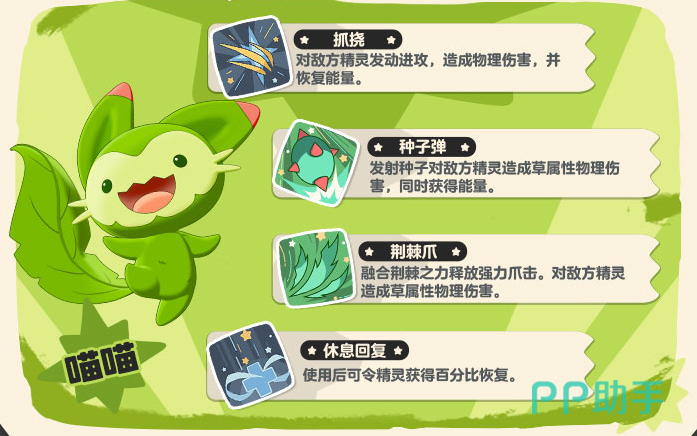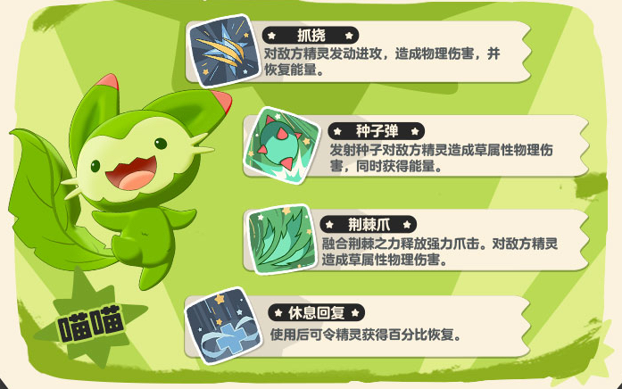 喵喵属于草属性,适合喜欢均衡玩法,注重生存与续航的玩家。它的特性 “氧循环” 很实用,释放草系技能时可以回复部分生命值,战斗中能一边打一边回血,“打不死的小强” 说的就是它,而且喵喵技能多样,能攻能守。