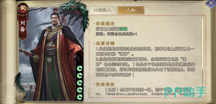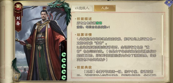 此技能是在场持续生效的技能,能够让场上所有角色一直拥有技能激将,就是用的时候大家要注意当此技能被封禁或者移出时,全场所有角色的激将也会同时失效,但是由于出杀次数是在出牌阶段开始时重置的,所以即使出牌阶段内失去了激将效果,出杀次数也不会因此减少,然而当出现特殊情况导致仁和技能被封禁或者是从游戏中被移出时,场上原本因该技能而拥有激将效果的所有角色会瞬间失去这一加成,出杀次数回归正常状态。
