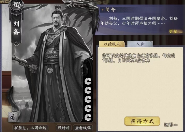 刘备在代号杀游戏里初始拥有5点体力数值,其核心技能为以德服人,此技能效果极为实用且独特,能够让玩家将任意数量的手牌交给任意角色,并且每成功交出一张牌,自身能恢复一点体力,这意味着玩家在出牌阶段可以依据场上局势灵活发动该技能,理论上只要手牌足够,就能够实现无限制地回复体力,例如当刘备在第一回合不幸遭遇敌方集火攻击导致手牌有所损耗时,若在第二回合将剩余的手牌全部交出,不仅可以瞬间把手牌打光,还能将体力补满。