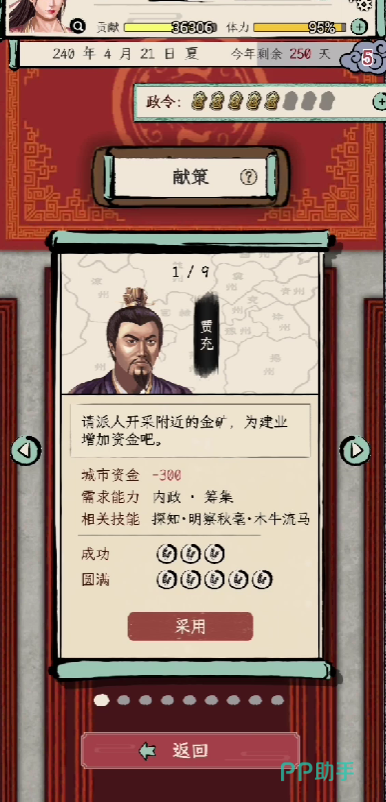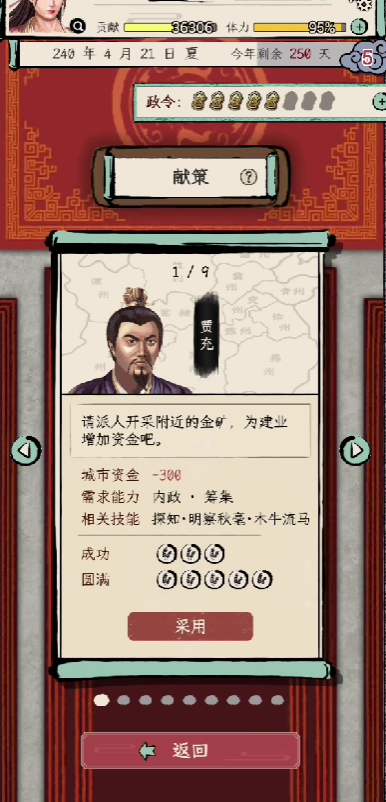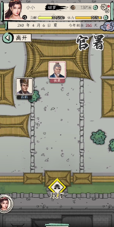 而在进入到第二年时,则建议玩家不要尽快升官,由于升官速度太快,玩家的资源获取率可能跟不上消耗率,会导致玩家前期功亏一篑。