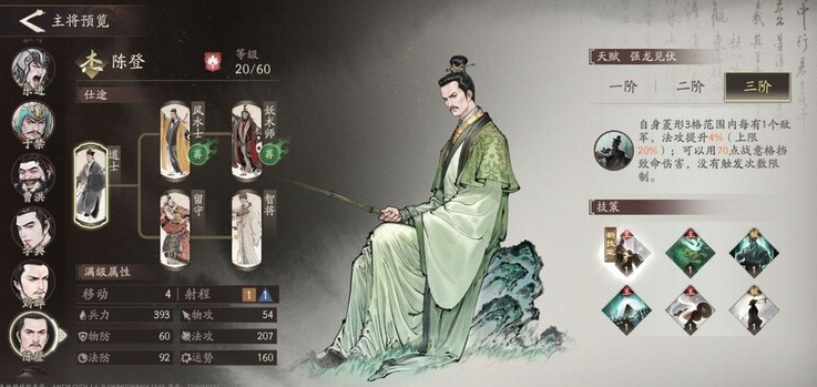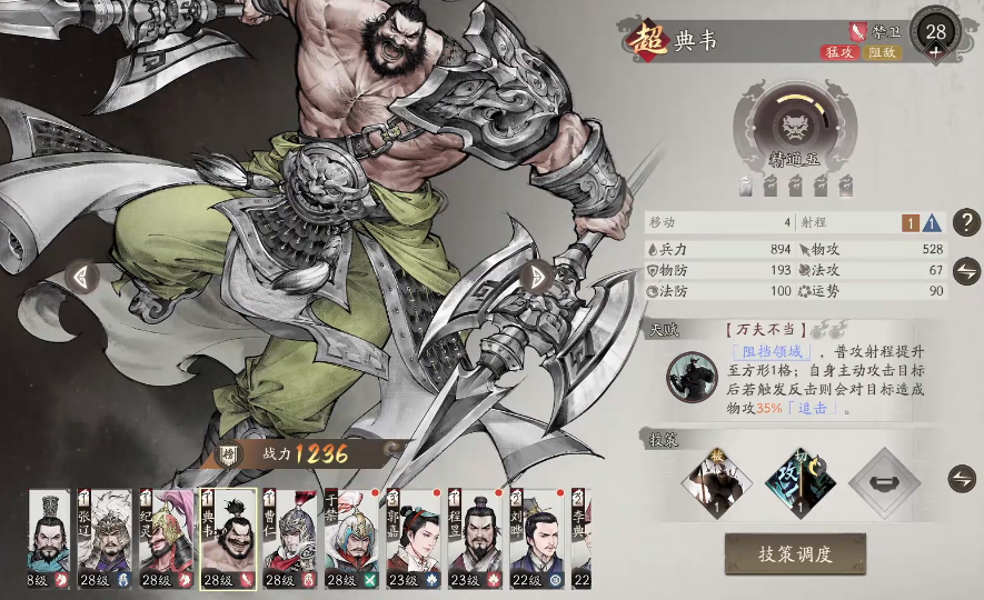 陈登和典韦同样是值得重点培养的角色。陈登在周围三格范围内存在敌军时,法术攻击力提升4%,且可在危急时刻消耗战役值触发一次致命伤害免疫,相当于拥有一条保命机制,极大增强了战场存活率。典韦作为近战战士,拥有出色的防御属性,其重击技能可对目标造成等同于自身攻击力100%的物理伤害,兼具控制与输出能力,适合担任前排攻坚角色。