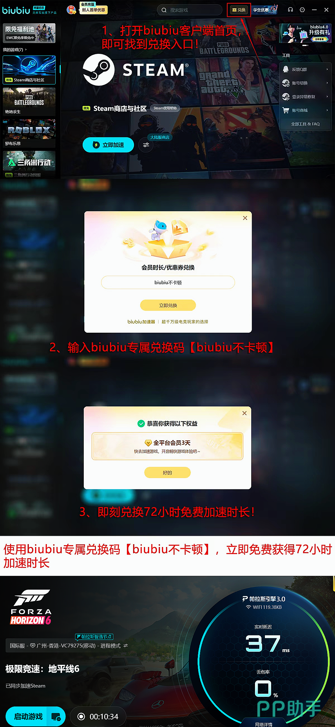 加速服务配套福利同步升级:新用户完成注册即可获赠24小时全游戏通用加速时长;所有用户输入兑换码【biubiu不卡顿】,还可额外领取3天免费加速权益,零门槛体验稳定低延迟对战环境。