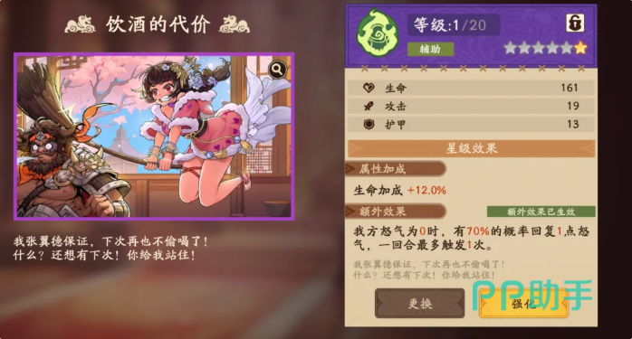若暂未获取世之奇才,可选用紫色溯影“饮酒的代价”作为过渡方案。该装备提供12%生命值加成;其主动效果为:当己方角色怒气为0时,有约70%概率为其恢复1点怒气,每回合限触发1次。需注意,该效果随溯影等级提升而增强触发概率与恢复量,建议优先升至高等级以保障实战稳定性。虽治疗与怒气联动强度不及金色专武,但对前期阵容成型具有实用价值。