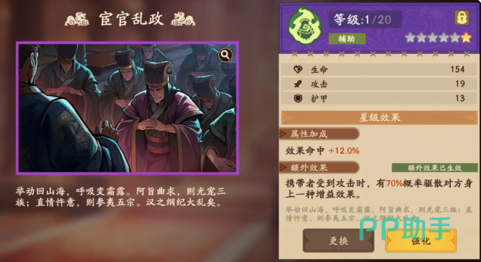 此外,“宦官乱政”作为紫色溯影亦具战术价值。其提供12%命中率加成,并附带被动驱散效果:当郭嘉受到敌方攻击时,有70%概率移除目标1个增益状态。该效果虽不直接提升生存或治疗,但在对抗高爆发、强Buff阵容(如携带“铁索连环”“无懈可击”等锦囊的敌方核心)时,可有效削弱对方增益链,间接保障郭嘉存活率及辅助节奏,适用于特定环境下的功能型搭配。