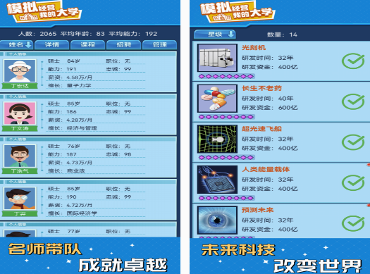 置身于这款独立游戏以后,大家也能看到大学的美好生活,扮演的是学校的校长,为了使自己的大学拥有更多的学生,不仅要注重对学校餐厅的管理,招聘优秀的厨师,调整菜品以及价格,满足学生的需求。同时还可在实验楼以及各种场所当中,做一些学生们会做的一些事情,包括体育运动或者是高难度的实验,展现出自己在管理和制定策略方面的实力。