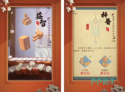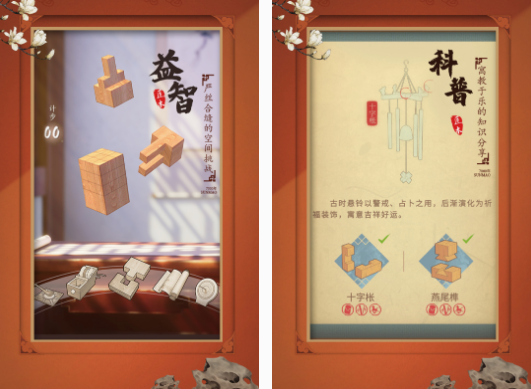 相对于大家常见的游戏,这款在玩法内容上比较独特,也是融入了与木匠,这种行业有关的解谜手游,可发挥玩家,在空间这方面的想象力,上手非常容易。既能享受国粹文化所带来的魅力,同时它也是比较益智的,在你了解与匠木有关的内容以后,可凭借严丝合缝等方面的实力,进行空间这方面的挑战,更是寓教于乐的有很多的知识,可进行科普。