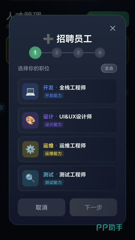 每位候选人具备清晰可见的五维能力模型(如技术力、产品力、运营力、管理力、抗压值),玩家须结合当前项目类型、预算上限及团队结构缺口进行精准匹配。招聘仅为起点,后续还需持续投入培训资源提升个体能力,并依阶段目标动态调整岗位配置。若忽视员工状态管理,士气下滑将直接拖慢研发进度,甚至引发核心成员流失。