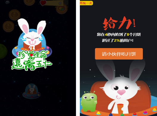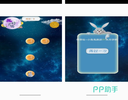 这款以月饼为主的小游戏中,既能看到各种颜色的月饼,同时也能看到可爱的小兔子。需要你在玩的过程中,点击开始游戏。如果能让小兔子跳到月饼上以后,就可获得相应的分数。由于里面每个颜色的月饼所具备的分数不一样,所以你在玩的时候,也有着一定随机性,需要为了获得高分,而正确点击屏幕,让小兔子不断跳跃。