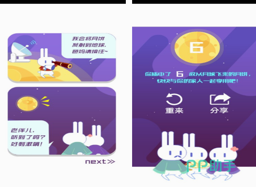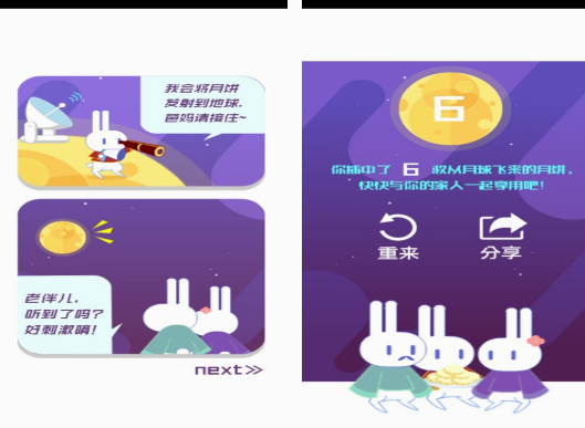 为了给大家带来浓郁的中秋节氛围,这款以插月饼为主的游戏,也能看到可爱的玉兔,甚至是月球。而且还有丰富的故事剧情,在兔子意外的进入月球上以后,为了帮助在月球上的兔子,顺利的将月饼分享给离自己非常遥远的家人,需要你使用简单发射的方式,让爸爸妈妈接住。你在玩的时候,每次都会有5次机会。
