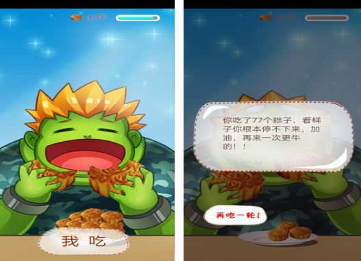 这同样是玩法比较简单,以吃月饼玩法为主的游戏,通过不断点击屏幕以后,里面的角色就开始进入疯狂的吃月饼中,在计时结束之前,需要看一看玩家,在点击屏幕这方面的速度,了解到了数量以后,就可以知道自己到底吃了多少月饼。有独特的游戏设置,以及简单的玩法,在开启游戏以后,你就需要一直的点击屏幕。