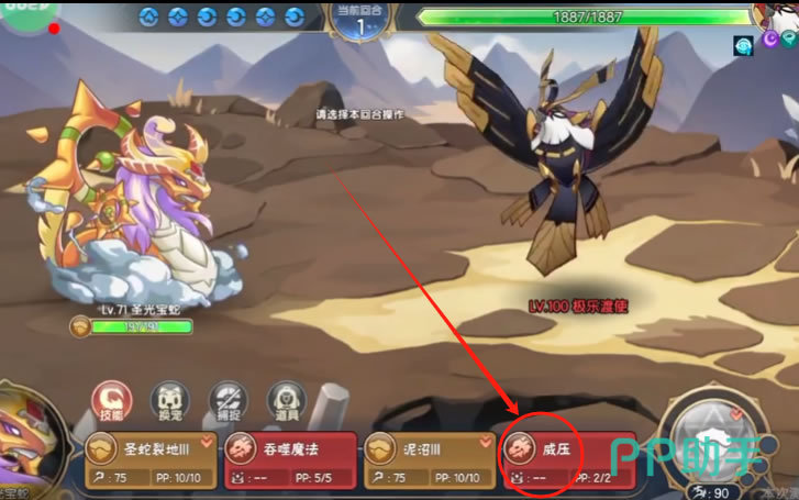 由于极乐渡使速度很快,所以在安排先手出场的角色时,要考虑延迟它的出手顺序,以便速度较慢的波多来降低它的物防属性。这里选择首先出场的是圣光宝蛇,首先是因为圣光宝蛇不会第一回合就被秒杀,其次它的技能威压能够造成先手加3,同时让对手本回合无法行动的效果。释放完之后被Boss打死,圣光宝蛇就完成了它的使命。