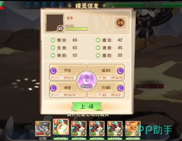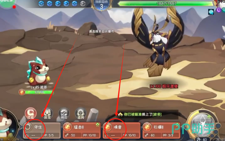 紧接着出场的是波多,大家都知道波多出场一定是使用“守住”和“噪音”这两个技能,降低对手的物理防御能力;当然是连上四只波多,将极乐渡使的物防下降到非常低的水准。