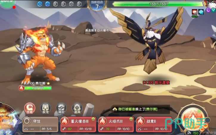 此时我方只剩下最后一个上场名额了,当然要派手下物理攻击最强的角色出战。很多朋友都会选择培养费尔斯这个强力战将,此时当然是释放大招必杀技,争取一下就将Boss击溃;即使第一击没有杀死Boss,估计它也不剩多少血了,而费尔斯当然是不会被瞬秒的,下一回合再随便补一个技能就能结束战斗了。