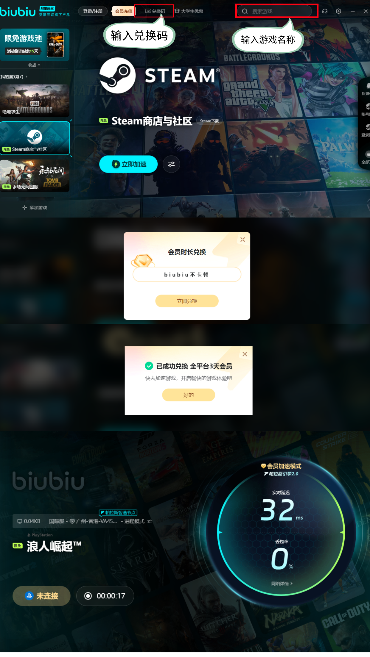 大家玩的时候还可以同步下载上方给大家提供的加速器,因为游戏本身画面质量是比较高的,用了加速器之后,大家玩儿起来会更加流畅,而且新用户下载的话还有很多福利,比如注册就有3小时免费加速的机会,后续还可以继续用平台给大家提供的口令biubiu不卡顿去继续换三天的体验时间。