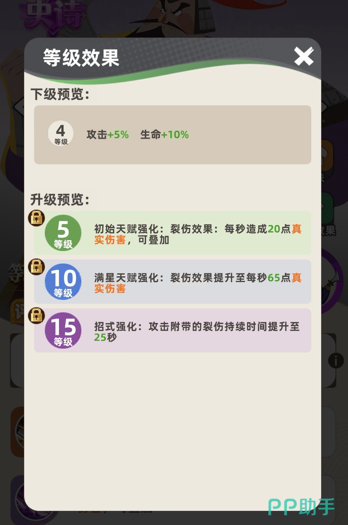 在等级成长方面,华雄的强化方向高度聚焦于裂伤效能提升。升至10级并达成满星后,裂伤每秒造成的真实伤害上限提升至65点;当等级达到15级时,单次裂伤的持续时间延长至25秒。这一成长路径决定了华雄并非爆发型选手,而是典型的“越战越强”型战士,需配合高生存能力与稳定续航的队友,方能最大化其机制优势。
