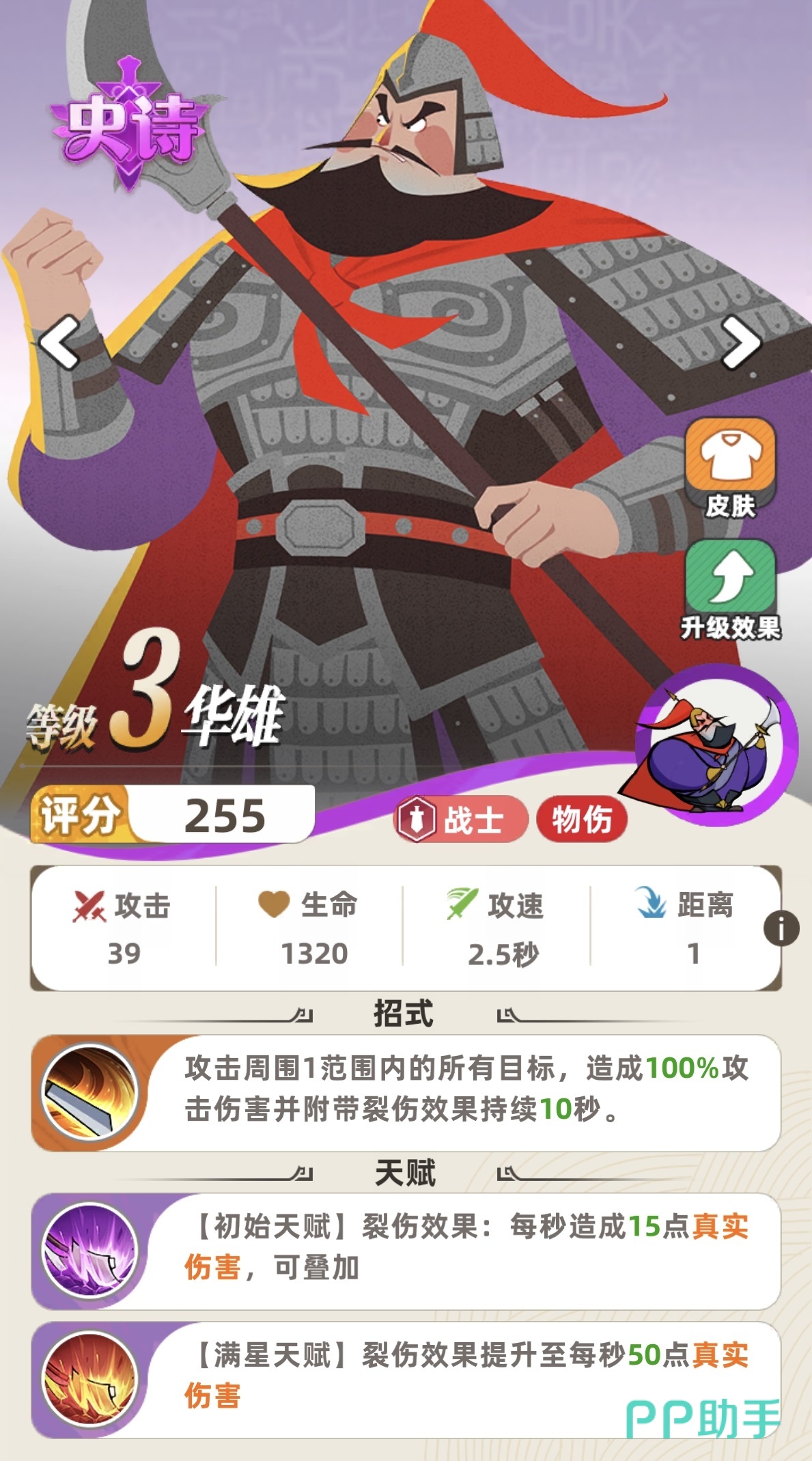 华雄是《王者之弈》自走棋中一位定位清晰、机制独特的史诗品质战士英雄。尽管其初始品级并非顶尖,但凭借围绕“裂伤”构建的持续作战体系,在中后期团战中具备不可忽视的战略价值。本文将从技能机制、成长路径、阵容搭配及实战定位四个维度,系统解析华雄的使用逻辑与运营要点。