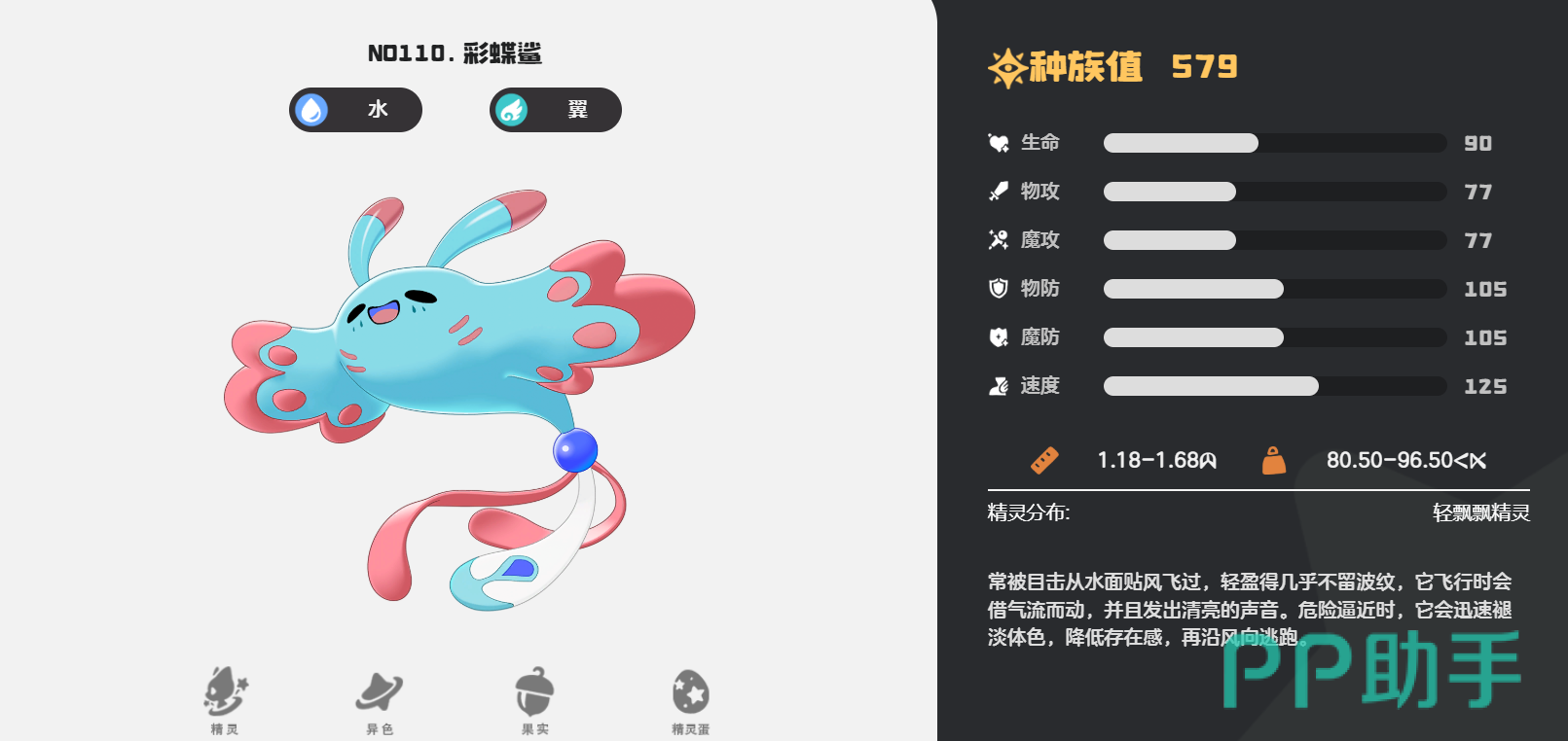该精灵拥有明确的三段式成长路径:初始形态为风铃鲨,分布于猛兽森林炼金台以东的峡谷河道区域;32级时可进化为蓝蝶鲨,外形更显轻盈飘逸;55级完成最终进化,成为完全体彩蝶鲨。此外,高阶训练师还可通过特殊合成方式——累计放生10只首领级宠物以炼制首领秘药,使彩蝶鲨进一步突破极限,进阶为神谕鲨形态,获得属性与技能层面的全面强化。