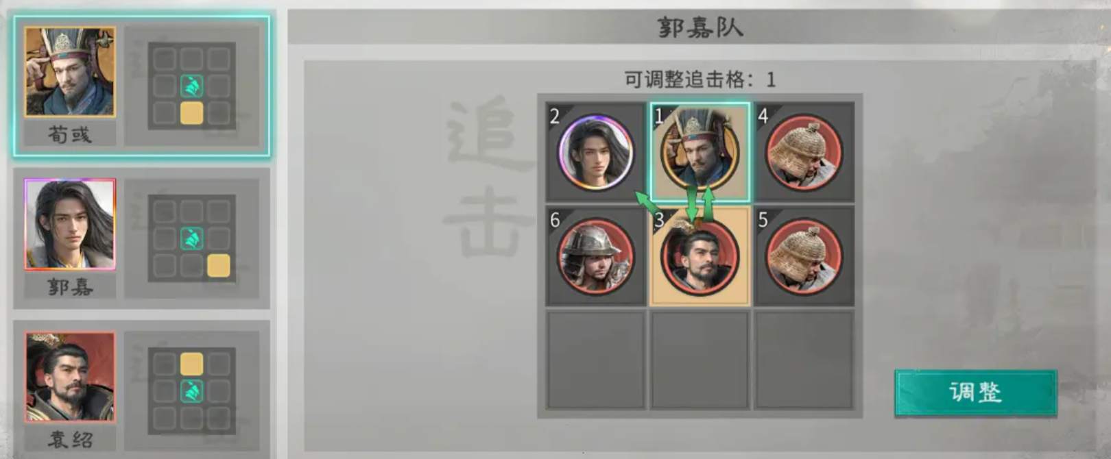 站位设计尤为关键:袁绍需置于荀彧与郭嘉的追击格范围内,确保“王佐”效果全程生效;荀彧也应踩在袁绍追击格上,形成双向增益闭环;郭嘉站位相对灵活,只需靠近核心输出区域即可发挥补刀与控场作用。三者均需至少升至鎏金品质,方能激活完整追击链与天赋联动逻辑。