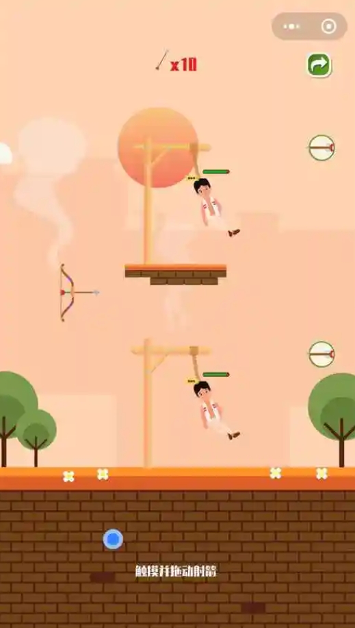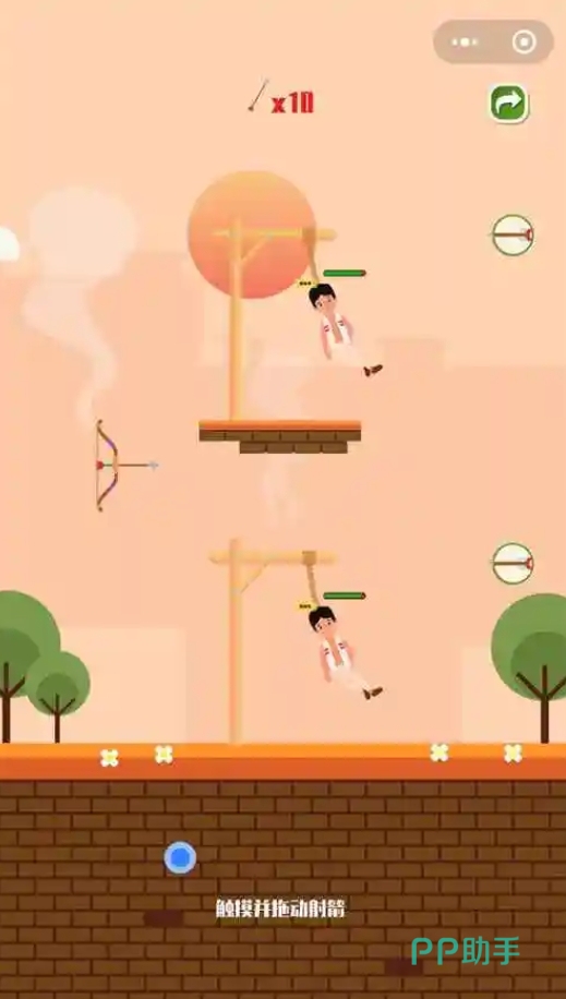 使用自己的箭术来将人质救下吧,每道关卡都有不同数量的人质遭到生命的威胁,各位需利用好手里的弓箭,来将绳子给射断,好令他们都得以获救。游戏有着很出色的益智趣味,每次进行闯关时玩家都有十次射箭机会,人们需合理地去规划好箭矢射出的角度,并弄清各关卡的机制规律,这样才能更好地来完成救援任务。