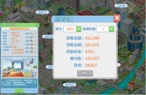 当玩家达到一笔巨额时,就要从城市中选择并确定房源,在此过程中需要考虑的事情有很多,比如房子的位置以及房屋的面积等等。而且还关乎着未来的生活方式以及生活质量,在高楼大厦平地起的城市中,选择性价比超高的房子是尤为重要的。接下来当确定了房源后就要支付首付,可以直接点击购房的按钮进入支付。