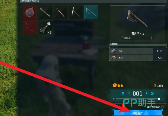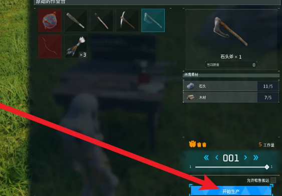 制作石斧需前置解锁“原始作业台”,该设施可在出生区域附近快速建造完成。所需材料明确且易得:5根木材 + 5块石头。其中,木材可通过徒手击打任意树木获得;石头则来自地图中散布的灰色岩石,使用空手或任意未强化工具敲击即可掉落。整个收集过程无需远距离移动,出生点周边半径200米内通常即可满足全部需求。制作流程共分三步:第一步,靠近已放置的原始作业台并交互;第二步,在弹出的制作界面中定位“石斧”配方,点击选中后系统将实时校验背包内材料存量,并高亮显示短缺项;第三步,确认材料齐备后点击“开始生产”,约1–2秒即完成合成,无等待倒计时或额外操作负担。