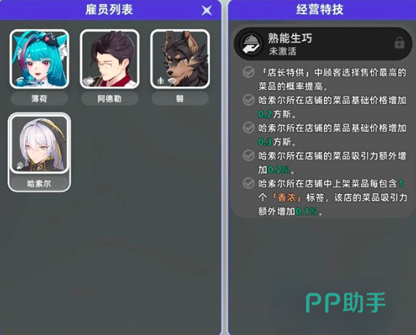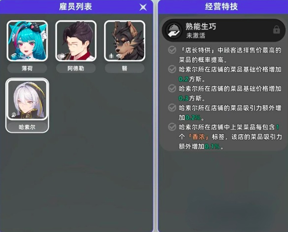 开店首步并非上架商品,而是完成基础功能解锁。进入“管理店铺”界面后,需重点操作右侧的“经营特技术”模块——此处是提升经营效率的核心入口。务必优先招募指定雇员,并激活对应技能链。推荐优先解锁哈索尔的专属技能“熟能生巧”,该技能生效后将同步触发“店长特供”机制:顾客倾向选购高价高级菜品;同时,全店商品售价自动上浮0.2~0.3方斯;甜品及糖果类目额外获得“香浓”品质标签,显著提升整体产品评级。