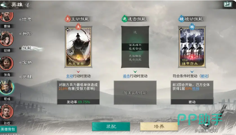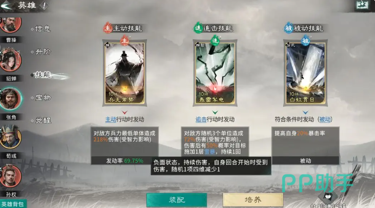 鉴于张角主动技无残血收割能力,建议技能栏优先配置兵无常势。该技能可有效规避负面状态蔓延风险,防止弱点效果波及荀彧或貂蝉,保障辅助链完整运转。