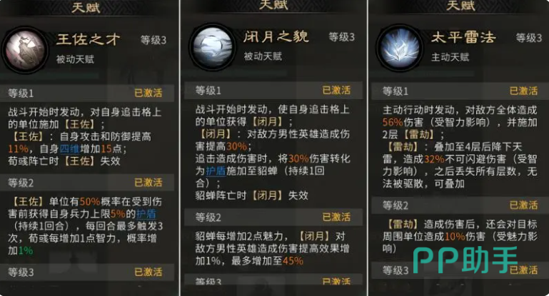 荀彧推荐携带天赋王佐之才,该效果可为张角提供11%攻击与防御加成,并额外提升四维属性各15点。此增益不仅强化张角生存与输出能力,更使其在阵亡前仍能完成技能释放,保障雷劫层数的稳定叠加上线。