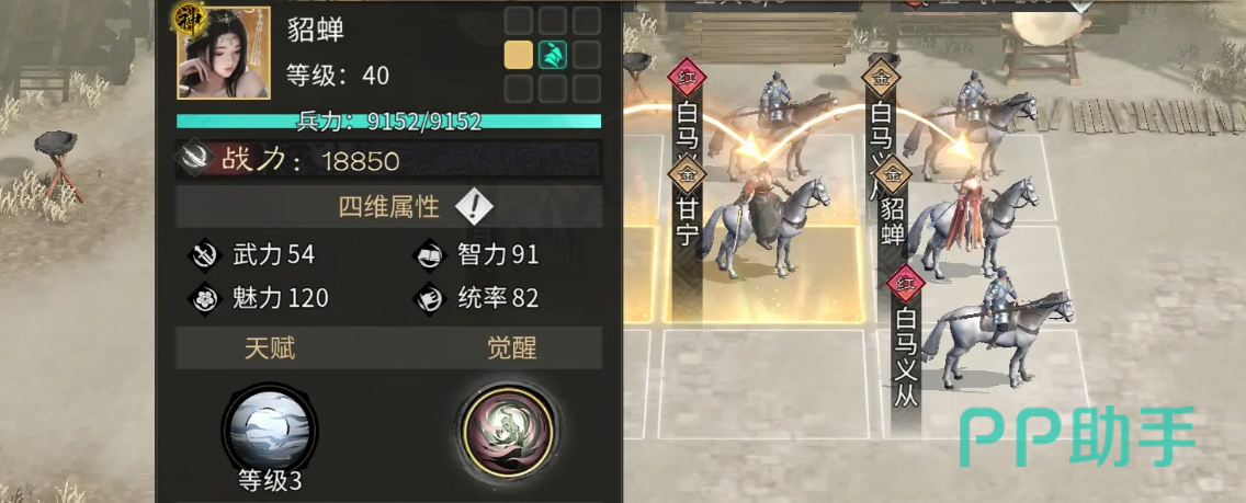 貂蝉天赋选用闭月之貌(需升至3级),生效后可使我方全体对敌方男性武将造成的伤害提升30%。该效果直接放大张角雷系群体伤害的实际收益,同时提升其追击触发频率。此外,貂蝉自身可通过“闭月”状态获得额外生存反馈机制,在造成伤害的同时强化自身续航能力,进一步巩固队伍稳定性。