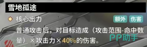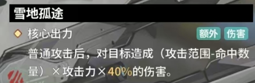 而她在战场上所施展的核心出力技能叫做雪地孤途,是在普通攻击之后,能够精准地对目标造成攻击范围-命中数量×攻击力×20%的伤害,那一瞬间爆发出来的强大力量是很少角色能够达到的。
