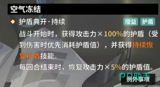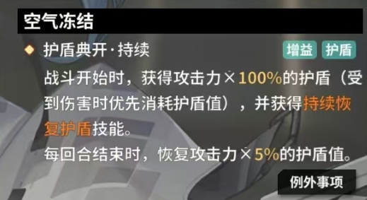 当空气冻结这个技能带来的护盾典开效果在战斗开始时触发,她便能获得攻击力×40%的护盾,这护盾就像是一层坚固的铠甲,在受到伤害时会优先消耗护盾值,保障了她在战场上的生存能力,让她能够更加无畏地冲锋陷阵。