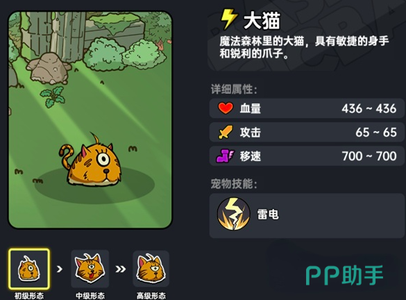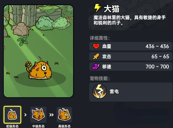 第二个宠物的话是大猫,它可产生较强的雷属性攻击,来自于魔法森林的地图当中,是一个敏捷型宠物,攻击能力超强。技能为打雷,在美国20秒的情况下就可释放一次雷电技能,对敌方造成雷属性伤害,该角色的CD时间较短,1秒即可发动第二次进攻。