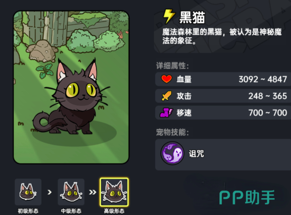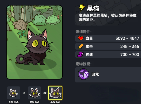 第三个宠物是黑猫,它与大猫同样为雷属性宠物,在技能方面擅长诅咒,在技能释放的瞬间,则会使敌人陷入混乱状态0.5秒,在面对一些较强的boss时,可直接使用黑猫,打断boss的蓄力技能,为玩家击败boss提供更多容错率。