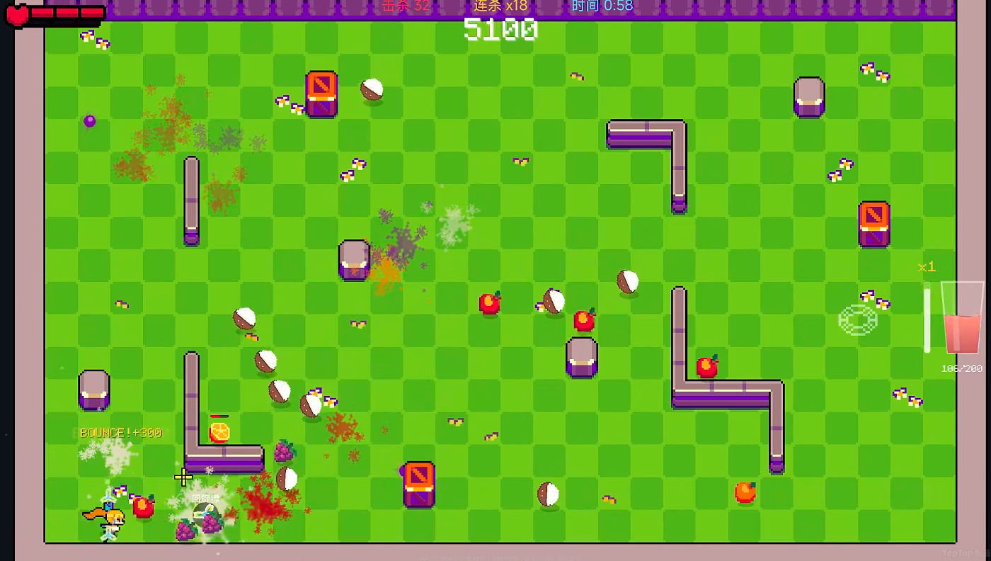 游戏强调操作响应与节奏把控,葡萄类敌人高频突进特性促使玩家持续优化走位与闪避时机,在反复试错中建立肌肉记忆。当积累满一颗苹果能量后,角色进入暴走状态,攻击范围、攻速与击退效果同步提升,实现暴力美学与操作快感的高度统一。满屏果汁迸发的视觉冲击,成为核心记忆点之一。