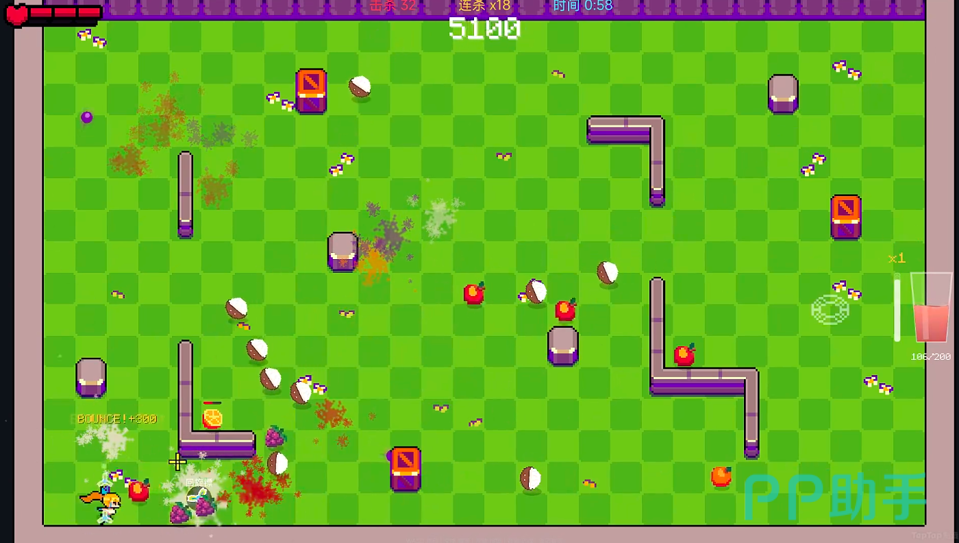 美术层面采用像素基底叠加漫画式动态表现,塑造出高辨识度的视觉语言。水果系敌人设计弱化压迫感,以拟人化形态呈现,配合刀光划过瞬间的果汁喷射、果肉飞散等物理反馈,强化操作正向反馈与情绪释放效果。