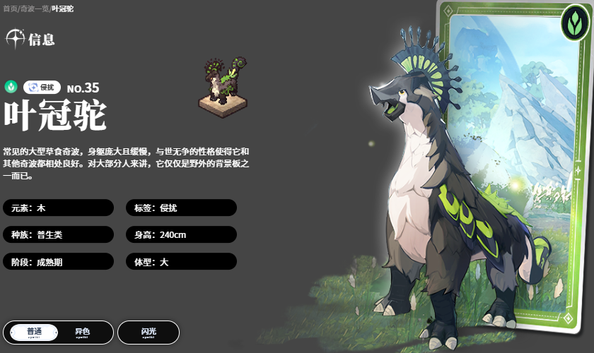 木系奇波“叶冠驼”定位为团队守护者。推荐技能组合为【治愈守护】、【株连灵木】、【灵木弹】与【叶冠碎击】。其中【治愈守护】可恢复全体队友5.3%最大生命值,并附带10秒嘲讽效果,有效转移仇恨、保护关键输出位;防御阶段可触发减攻增防机制,显著削弱敌方威胁。大招【灵木弹】可在扇形范围内发射12发弹体,造成高额木属性范围伤害,同时为我方提供长时间减伤增益,是持久战与群怪环境下的生存保障核心。