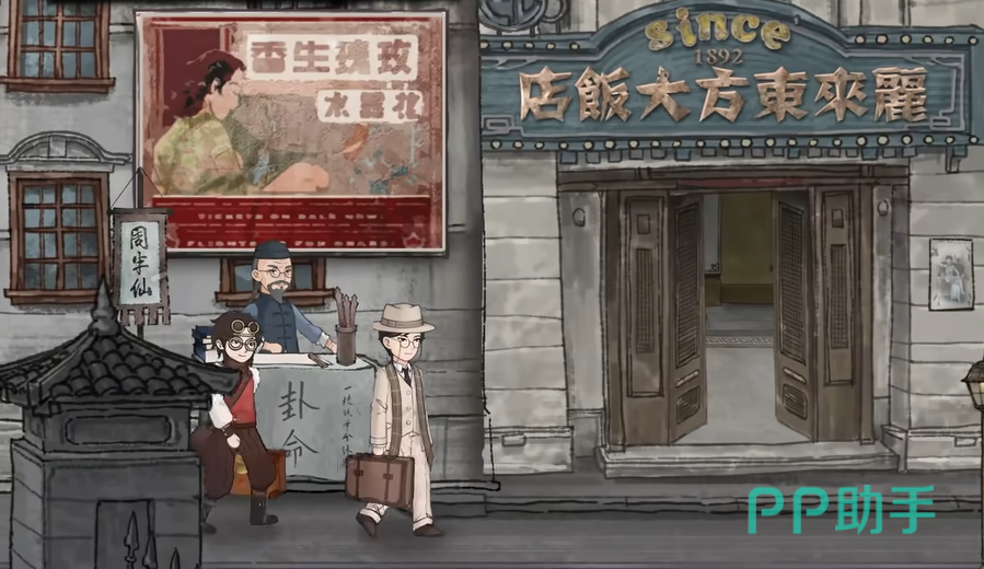 时间推进至次日清晨,操控角色切换为阿福。因主人一夜未归而心生忧虑,阿福主动外出寻找线索。抵达洋货铺时,发现现场已被封锁,巡捕禁止无关人员进入。此时文可忻登场,通过与其对话,阿福得以借助她的协助收集外围情报,逐步揭开事件真相。