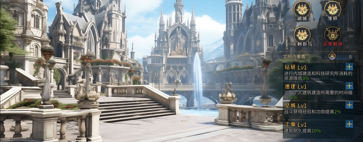 了解完这些之后,我们可以大致知道一个文明该怎么玩了。这里小编拿大不列颠举例,其文明有一个技能,就是“尖刺拒马”,其效果为“敌人在进攻之前,必须先攻击尖刺拒马”,我们可以通过释放这一“技能”,来阻截敌人的攻击,达到迟滞的效果。而大不列颠文明还有一个“特性”,工事,其效果是“所有建筑耐久+10%”,而我们的尖刺拒马正好在游戏中判断为建筑,所以血量能在原本基础上再加10%。可千万不要小瞧这两个“技能”的联动,在前期大家攻击力都没那么高的情况下,一个尖刺拒马就足以成为敌人的“叹息之墙”了,而“工事”所加的10%,更是令敌人可以对一个拒马头疼半天。当然,其它文明之间也各有技能联动,例如华夏文明的神行营与开拓,维京文明的征召与维京大营,碍于篇幅限制,小编就不在这里一一举例了。