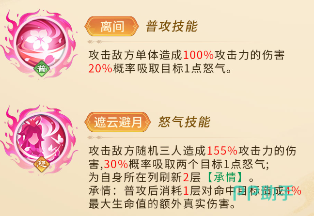 作为兼具控制与持续伤害的特殊型武将,貂蝉在玩家中也有着不俗的评价。她的攻击不仅能造成直接伤害,还具备干扰敌方能量条的能力。普攻可对目标造成100%攻击力的伤害,并有20%概率吸取1点怒气,有效延缓对手大招释放节奏。主动技能可随机攻击三个敌人,造成155%攻击力的伤害,并有30%几率吸取怒气,同时叠加2层“承情”效果。每次普攻会消耗一层承情,触发时对目标造成其最大生命值4%的真实伤害,对于高血量单位具有显著压制作用。