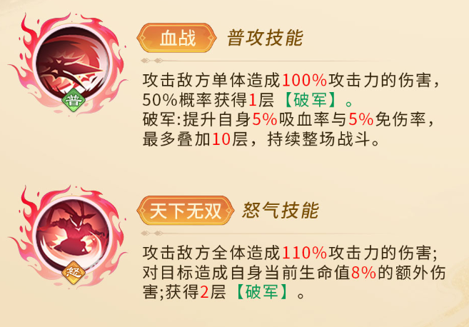 大招“天下无双”可对全体敌方单位造成110%攻击力的范围伤害,并附加相当于自身当前生命值8%的额外真实伤害,同时为自己添加2层破军效果。天赋使其拥有蛇魂形态,在普攻时可恢复2点怒气,加快技能释放节奏。达到2星时获得10%生命加成,3星时额外提升10%防御。其专属武器方天画戟提供11万生命值、14716点攻击力及3679点防御力,并额外赋予三项属性各1%的增益。武器升星后还将激活更强力的被动加成,是不可或缺的核心装备。