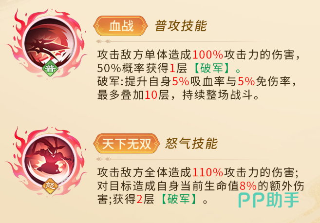 素有“人中吕布,马中赤兔”之称,其在游戏中的强度也完全匹配这一威名。吕布不仅是目前武将中攻击面板最高的存在,整体综合能力也处于梯队顶端。普攻“血战”可对单个敌人造成100%攻击力的伤害,并有50%几率获得“破军”状态,每层提供5%吸血与减伤效果,最多叠加10层,且效果可持续整场战斗,极大增强了生存与持续作战能力。