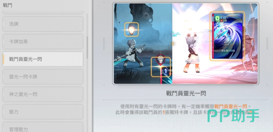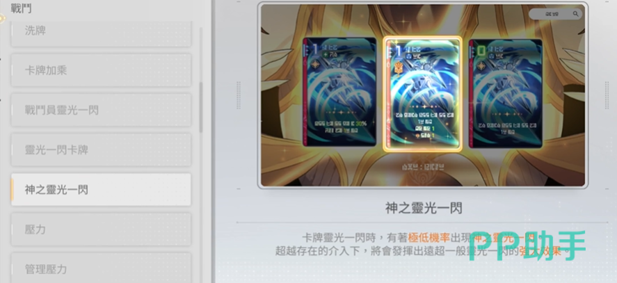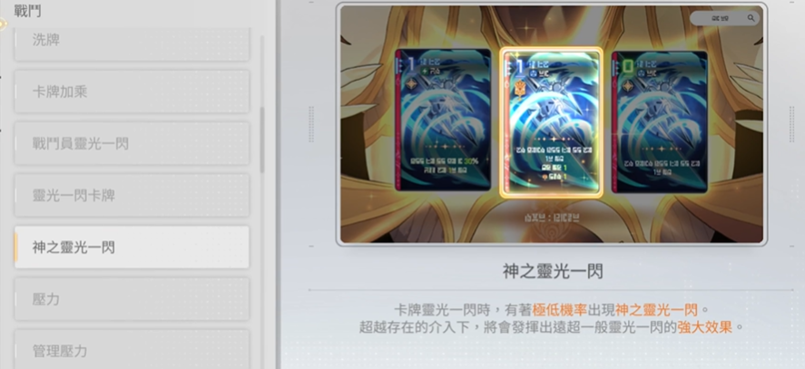 游戏内存在名为“灵光一闪”的基础机制:战斗过程中,玩家有一定几率获得临时增益卡牌,效果涵盖攻击力提升、生命上限增加、防御强化、技能冷却缩减、行动点(AP)补充等。该机制分为两类——战斗员专属灵光一闪与通用卡牌灵光一闪。当灵光一闪达到特定条件并完成进阶后,将演化为最高阶形态“神之一闪”,不仅附带更强力的属性加成,还会显著提升稀有词条的刷新率。