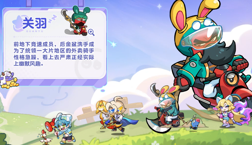 关羽定位为机动碾压型突进输出。其核心技能召唤“小电驴”单位进行四段连击,每次击中均附带击退效果;额外施放时可生成强化版火焰小电驴;每30秒还可召唤一支完整车队,车队数量越多,整体碾压频率与单次伤害基数越高。该机制使其在突破阵型、分割战场及快速清杂方面具有不可替代性,技能等级提升后车队刷新效率同步加快,成长曲线陡峭。