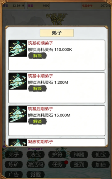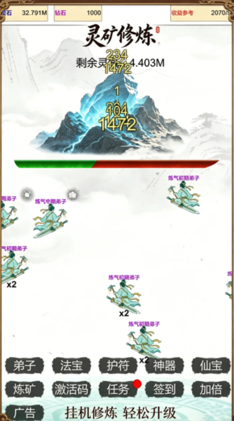 装备系统围绕采矿效率深度设计——消耗普通灵石可强化鹤嘴锄、聚灵镐等基础法器;高阶灵石则用于锻造飞行载具与灵脉探测罗盘,显著提升单次探查范围与挖掘倍率。当玩家解锁极品灵脉后,将触发海量灵石爆发式产出,配合高速运转的弟子梯队,可快速堆叠修为值,达成境界跃迁目标。