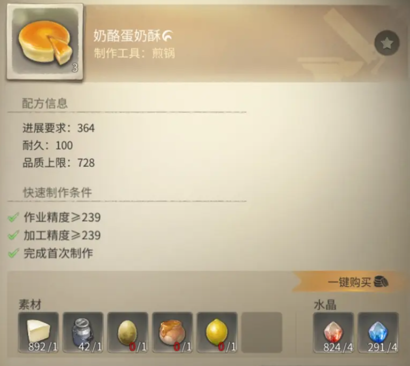 在制作的过程内,玩家并不会依赖装备属性,但是需要提前准备好适量的食材,例如水产品亦或是植物产品等等,烹调师在游戏内可以出售的道具,实际上需求量是比较大的,所以比较推荐玩家,在前期率先的点亮烹调师职能。