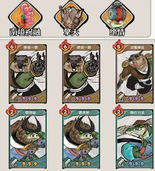 该玩法的核心逻辑在于构建稳定可控的能量循环:通过“以弹指一刹”实现卡组调度中枢,配合裂风斩或独行刀法补充爆发伤害,并由振龙吼持续返还怒气,确保每回合怒气充足。神兵选择上,擎天为必选项,主要作用是规避自动战斗中因随机抽卡(俗称“鬼抽”)引发的连锁断链;其余神兵可根据实际生存压力或输出缺口灵活配置。