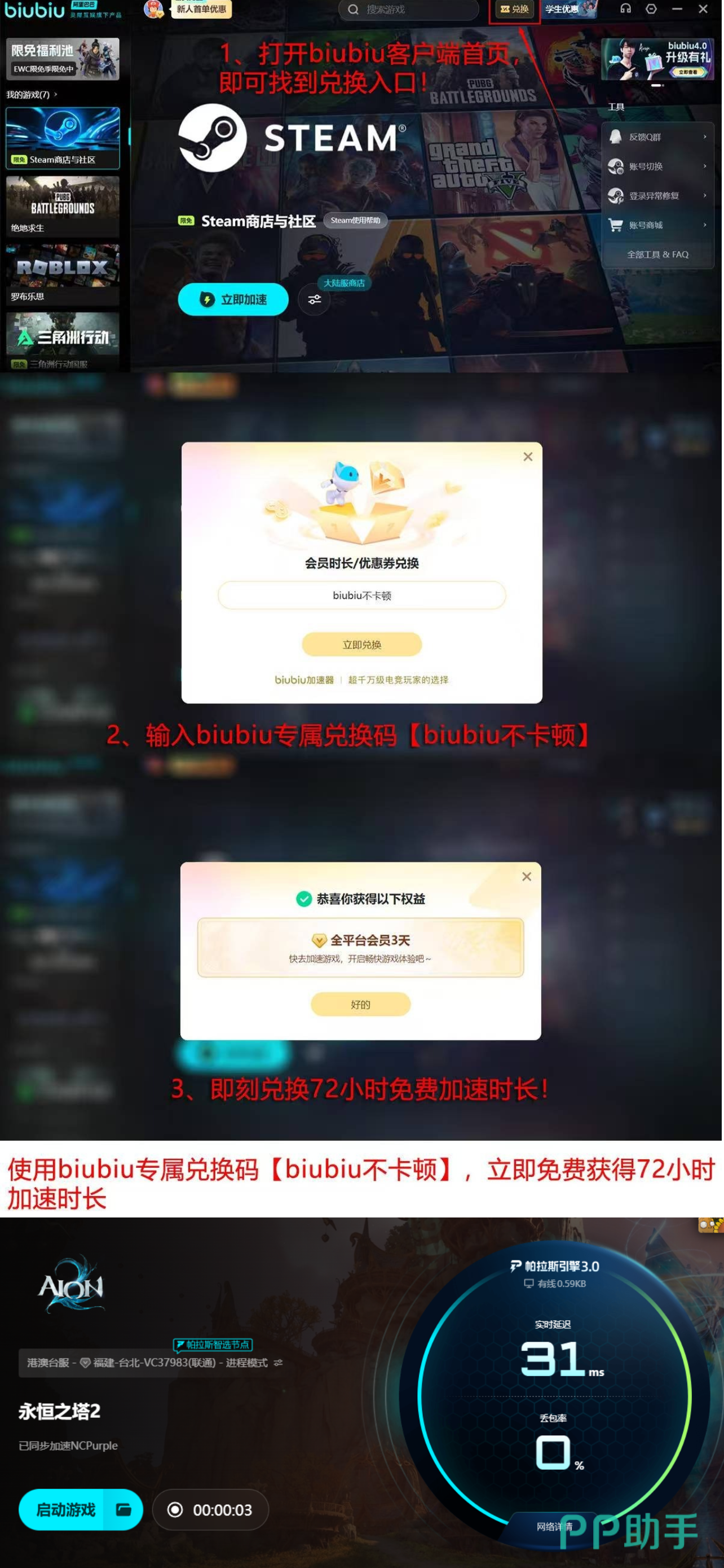 部分玩家可能担心产生额外费用,这一点完全不必顾虑。新用户注册登录后,系统将自动赠送一整天的免费加速服务,无需手动领取。同时,所有玩家还可通过兑换专属福利码【biubiu不卡顿】额外获得三天体验时长,每人限领一次,助力大家无忧畅玩。