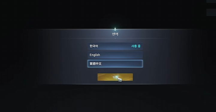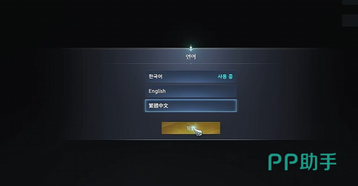 该游戏在韩服版本中内置了繁体中文选项,无需额外下载语言包。启动游戏后,在主界面右上角找到齿轮形状的设置按钮并点击进入。随后在顶部菜单中选择第三个标签页,底部则选择第一个选项,即可进入语言设置界面。在这里会显示韩文、英文以及繁体中文三种语言,直接选中繁体中文,并点击下方黄色确认框即可完成切换,整个过程简单直观。